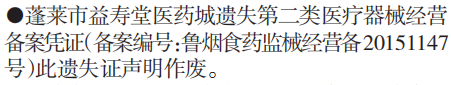 蓬莱市益寿堂医药城遗失第二类医疗器械经营备案凭证(备案编号:鲁烟食药监械经营备20151147号)此遗失证声明作废。