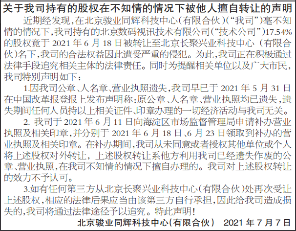 近期经发现,在北京骏业同辉科技中心(有限合伙)(“我司”)毫不知情的情况下,我司持有的北京数码视讯技术有限公司(“技术公司”)17.54%的股权竟于2021年6月18日被转让至北京长聚兴业科技中心(有限合伙)名下,我司的合法权益因此遭受严重的侵犯。为此,我司正在积极通过法律手段追究相关主体的法律责任。同时为提醒相关单位以及广大市民,我司特别声明如下: