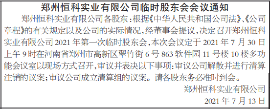 郑州恒科实业有限公司各股东:根据《中华人民共和国公司法》、《公司章程》的有关规定以及公司的实际情况,经董事会提议,决定召开郑州恒科实业有限公司2021年第一次临时股东会,本次会议定于2021年7月30日上午9时在河南省郑州市高新区翠竹街6号863软件园11号楼10楼多功能会议室以现场方式召开,审议并表决以下事项:审议公司解散并进行清算注销的议案;审议公司成立清算组的议案。请各股东务必准时到会。