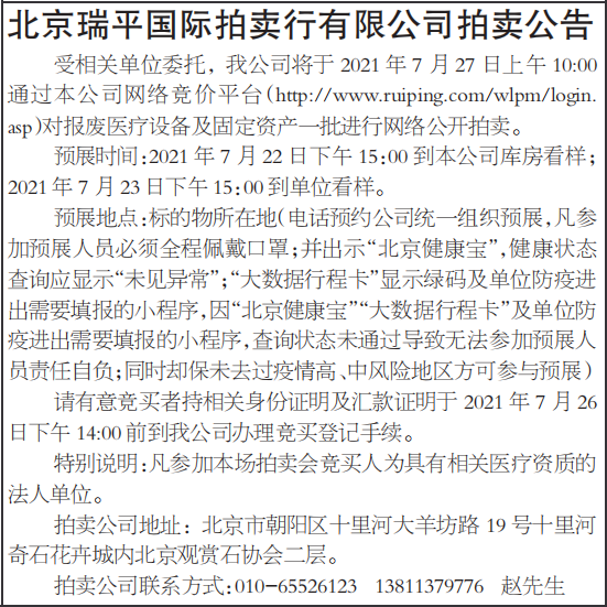 受相关单位委托,我公司将于2021年7月27日上午10:00通过本公司网络竞价平台(http://www.ruiping.com/wlpm/login.asp)对报废医疗设备及固定资产一批进行网络公开拍卖。