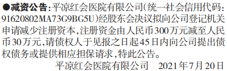 平凉红会医院有限公司(统一社会信用代码:91620802MA73G9BG5U)经股东会决议拟向公司登记机关申请减少注册资本,注册资金由人民币300万元减至人民币30万元,请债权人于见报之日起45日内向公司提出债权债务或提供相应担保请求,特此公告。