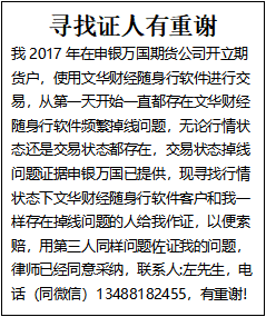我2017年在申银万国期货公司开立期货户,使用文华财经随身行软件进行交易,从第一天开始一直都存在文华财经随身行软件频繁掉线问题,无论行情状态还是交易状态都存在,交易状态掉线问题证据申银万国已提供,现寻找行情状态下文华财经随身行软件客户和我一样存在掉线问题的人给我作证,以便索赔,用第三人同样问题佐证我的问题,律师已经同意采纳,联系人:左先生,电话(同微信)13488182455,有重谢!