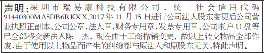 深圳市瑞易康科技有限公司,统一社会信用代码91440300MA5DB6RKXX,2017年11月15日进行公司法人股东变更后公司营业执照正副本,公司公章,法人章,财务专用章,发票专用章,公司帐户U盘等已全部移交新法人陈一杰,现在由于工商撤销变更,故以上转交物品全部作废,由于使用以上物品而产生的纠纷都与原法人和原股东无关,特此声明。