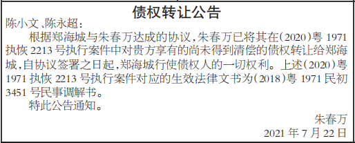 根据郑海城与朱春万达成的协议,朱春万已将其在(2020)粤1971执恢2213号执行案件中对贵方享有的尚未得到清偿的债权转让给郑海城,自协议签署之日起,郑海城行使债权人的一切权利。上述(2020)粤1971执恢2213号执行案件对应的生效法律文书为(2018)粤1971民初3451号民事调解书。