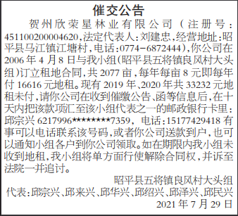 贺州欣荣星林业有限公司(注册号:451100200004620,法定代表人:刘建忠,经营地址:昭平县马江镇江塘村,电话:0774-6872444),你公司在2006年4月8日与我小组(昭平县五将镇良风村大头组)订立租地合同,共2077亩,每年每亩8元即每年付16616元地租。现有2019年、2020年共33232元地租未付,请你公司在收到催缴公告、函等信息后,在十天内把该款项汇至该小组代表之一的邮政银行卡里:邱宗兴6217996********7359,电话:15177429418有事可以电话联系该号码,或者你公司送款到户,也可以通知小组各户到你公司领取。如在期限内我小组未收到地租,我小组将单方面行使解除合同权,并诉至法院一并追讨。