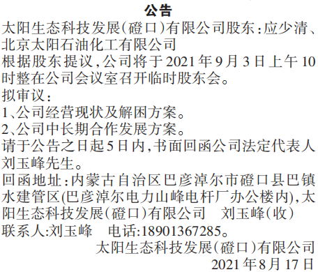 太阳生态科技发展(磴口)有限公司股东:应少清、北京太阳石油化工有限公司根据股东提议,公司将于2021年9月3日上午10时整在公司会议室召开临时股东会。