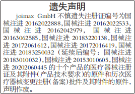 joimaxGmbH不慎遗失注册证编号为国械注进20162022888,国械注进20162022533,国械注进20162042979,国械注进20163062585,国械注进20183220138,国械注进20172061612,国械注进20172016419,国械注进20183250032(延续后编号:国械注进20183010032),国械注进20153010605,国械注进20202060445的十个产品的医疗器械注册证及其附件(产品技术要求)的原件和历次医疗器械变更注册(备案)批件及其附件的原件,声明作废。