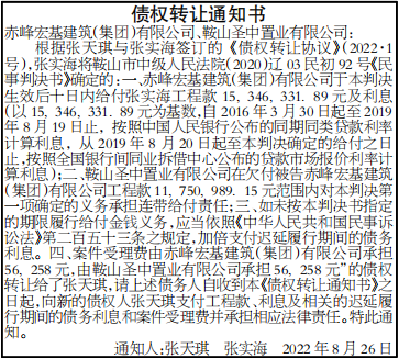 赤峰宏基建筑(集团)有限公司、鞍山圣中置业有限公司:根据张天琪与张实海签订的《债权转让协议》(2022·1号),张实海将鞍山市中级人民法院(2020)辽03民初92号《民事判决书》确定的:一、赤峰宏基建筑(集团)有限公司于本判决生效后十日内给付张实海工程款15,346,331.89元及利息(以15,346,331.89元为基数,自2016年3月30日起至2019年8月19日止,按照中国人民银行公布的同期同类贷款利率计算利息,从2019年8月20日起至本判决确定的给付之日止,按照全国银行间同业拆借中心公布的贷款市场报价利率计算利息);二、鞍山圣中置业有限公司在欠付被告赤峰宏基建筑(集团)有限公司工程款11,750,989.15元范围内对本判决第一项确定的义务承担连带给付责任;三、如未按本判决书指定的期限履行给付金钱义务,应当依照《中华人民共和国民事诉讼法》第二百五十三条之规定,加倍支付迟延履行期间的债务利息。四、案件受理费由赤峰宏基建筑(集团)有限公司承担56,258元,由鞍山圣中置业有限公司承担56,258元”的债权转让给了张天琪,请上述债务人自收到本《债权转让通知书》之日起,向新的债权人张天琪支付工程款、利息及相关的迟延履行期间的债务利息和案件受理费并承担相应法律责任。特此通知。