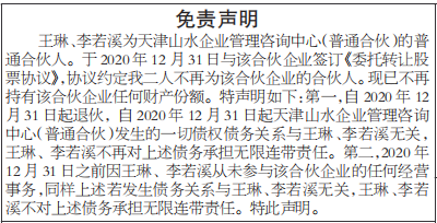 王琳、李若溪为天津山水企业管理咨询中心(普通合伙)的普通合伙人。于2020年12月31日与该合伙企业签订《委托转让股票协议》,协议约定我二人不再为该合伙企业的合伙人。现已不再持有该合伙企业任何财产份额。特声明如下:第一,自2020年12月31日起退伙,自2020年12月31日起天津山水企业管理咨询中心(普通合伙)发生的一切债权债务关系与王琳、李若溪无关,王琳、李若溪不再对上述债务承担无限连带责任。第二,2020年12月31日之前因王琳、李若溪从未参与该合伙企业的任何经营事务,同样上述若发生债务关系与王琳、李若溪无关,王琳、李若溪不对上述债务承担无限连带责任。特此声明。