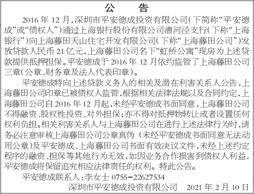 平安德成特向上述贷款义务人的相关及潜在利害关系人公告,上海藤田公司印章已被债权人监管,根据相关法律法规以及合同约定,上海藤田公司自2016年12月起,未经平安德成书面同意,上海藤田公司不得融资、股权性投资、对外担保;亦不得对抵押物转让或者设置任何权利负担。相关利害关系人与上海藤田公司在进行上述法律行为时,请务必注意审核上海藤田公司公章真伪(未经平安德成书面同意无法动用公章)及平安德成、上海藤田公司书面有效决议文件,未经上述约定程序的融资、担保等其他行为无效,如因业务合作损害到债权人利益,平安德成将保留追究相应法律责任的权利。特此公告。