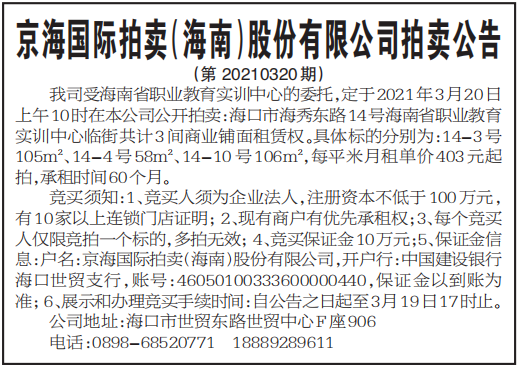 我司受海南省职业教育实训中心的委托,定于2021年3月20日上午10时在本公司公开拍卖:海口市海秀东路14号海南省职业教育实训中心临街共计3间商业铺面租赁权。具体标的分别为:14-3号105m2、14-4号58m2、14-10号106m2,每平米月租单价403元起拍,承租时间60个月。
