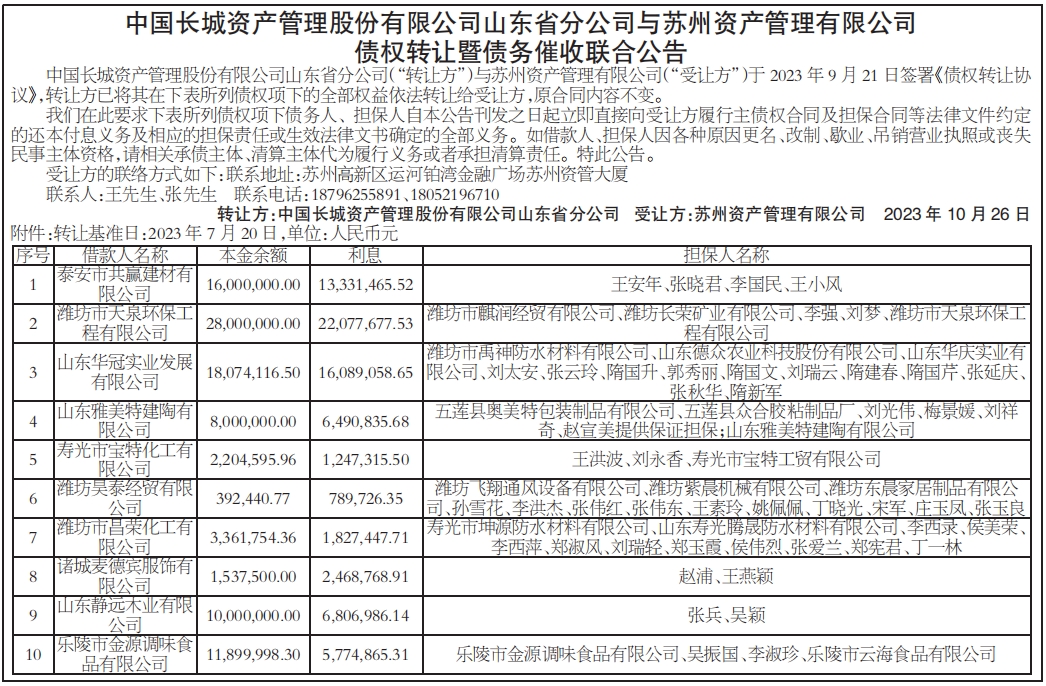 中国长城资产管理股份有限公司山东省分公司与苏州资产管理有限公司债权转让暨债务催收联合公告