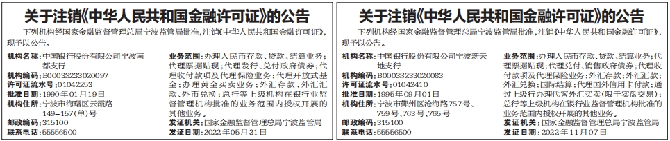 下列机构经国家金融监督管理总局宁波监管局批准,注销《中华人民共和国金融许可证》,现予以公告。