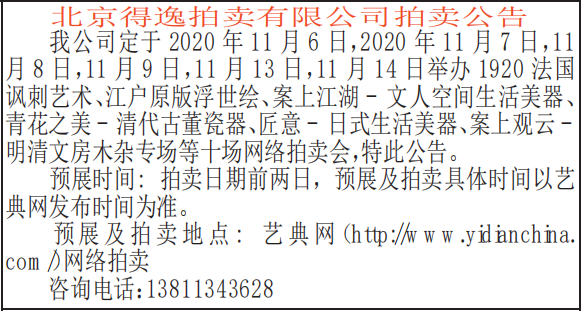 我公司定于2020年11月6日,2020年11月7日,11月8日,11月9日,11月13日,11月14日举办1920法国讽刺艺术、江户原版浮世绘、案上江湖-文人空间生活美器、青花之美-清代古董瓷器、匠意-日式生活美器、案上观云-明清文房木杂专场等十场网络拍卖会,特此公告。