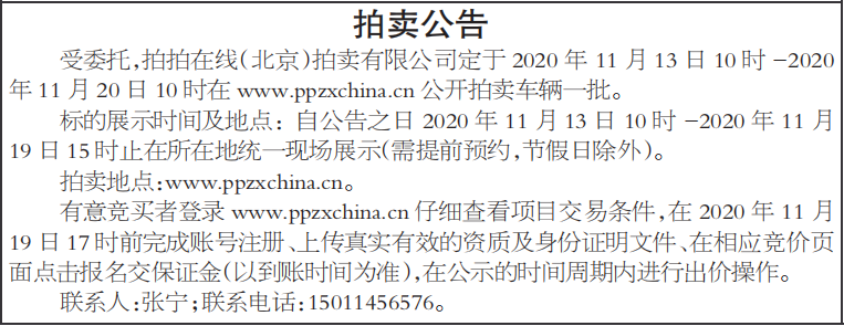 受委托,拍拍在线(北京)拍卖有限公司定于2020年11月13日10时-2020年11月20日10时在www.ppzxchina.cn公开拍卖车辆一批。