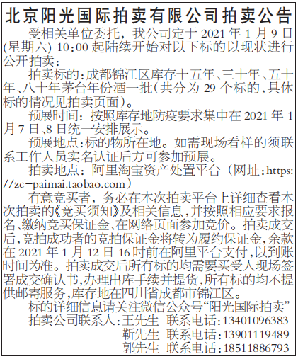 拍卖标的:成都锦江区库存十五年、三十年、五十年、八十年茅台年份酒一批(共分为29个标的,具体标的情况见拍卖页面)。