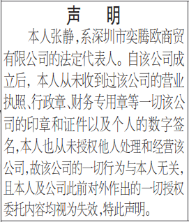 本人张静,系深圳市奕腾欧商贸有限公司的法定代表人。自该公司成立后,本人从未收到过该公司的营业执照、行政章、财务专用章等一切该公司的印章和证件以及个人的数字签名,本人也从未授权他人处理和经营该公司,故该公司的一切行为与本人无关,且本人及公司此前对外作出的一切授权委托内容均视为失效,特此声明。