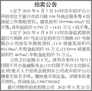 1.定于2021年6月7日10时在中拍平台公开拍卖位于嘉兴市洪兴路198号商业服务等8组房屋三年期租赁权。建筑面积55—946.05m2/组不等。首年起拍价0.792万-14.51万元/组不等。