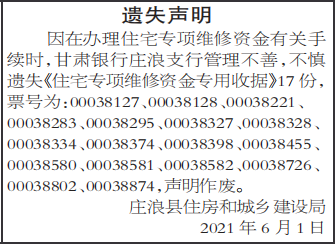 因在办理住宅专项维修资金有关手续时,甘肃银行庄浪支行管理不善,不慎遗失《住宅专项维修资金专用收据》17份,票号为:00038127、00038128、00038221、00038283、00038295、00038327、00038328、00038334、00038374、00038398、00038455、00038580、00038581、00038582、00038726、00038802、00038874,声明作废。