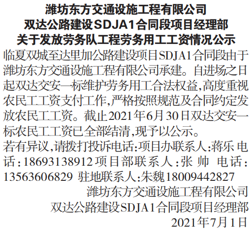 临夏双城至达里加公路建设项目SDJA1合同段由于潍坊东方交通设施工程有限公司承建。自进场之日起双达交安一标维护劳务用工合法权益,高度重视农民工工资支付工作,严格按照规范及合同约定发放农民工工资。截止2021年6月30日双达交安一标农民工工资已全部结清,现予以公示。