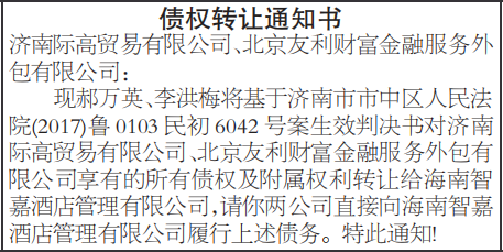 现郝万英、李洪梅将基于济南市市中区人民法院(2017)鲁0103民初6042号案生效判决书对济南际高贸易有限公司、北京友利财富金融服务外包有限公司享有的所有债权及附属权利转让给海南智嘉酒店管理有限公司,请你两公司直接向海南智嘉酒店管理有限公司履行上述债务。特此通知!