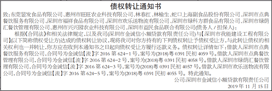 根据《合同法》和相关法律规定,以及我司(深圳市金诚信小额贷款有限责任公司)与【深圳市我能建设工程有限公司】(以下简称债权受让方)达成的债权转让协议,现将我司对你方持有的下列债权转让予债权受让方,与此转让债权的相关权利也一并转让,你方应在收到本通知书之日起向债权受让方履行还款义务。债权转让详情如下:借款人深圳市点典餐饮服务有限公司,合同号为金诚信【流】字2016第624-1号,案号为(2018)粤0391民初4059号。借款人深圳市点典餐饮管理有限公司,合同号为金诚信【流】字2016第624-2号,案号为(2018)粤0391民初4058号。借款人深圳市绿荫汇餐饮管理有限公司,合同号为金诚信【流】字2016第624-3号,案号为(2018)粤0391民初4057号。借款人深圳市欢乐送物流有限公司,合同号为金诚信【流】字2016第624-5号,案号为(2018)粤0391民初4055号。特此通知。