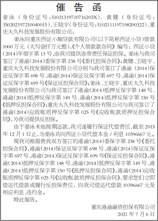 姜泳向重庆西证小额贷款有限公司(以下简称西证小贷)借款1000万元(大写壹仟万元整),《个人借款款合同》编号:西证小贷(2014)年借字第13号,由我司提供连带责任保证担保。姜泳与我司签订了港渝(2014)委保字第238号《委托担保合同》;黄健、王晓宇、重庆大久科技发展股份有限公司分别与我司签订了港渝(2014)保证反保字第698号、港渝(2014)保证反保字第697号、港渝(2014)保证反保字第699号《保证反担保合同》;姜泳、王晓宇、重庆大久科技发展股份有限公司与我司签订了港渝(2014)抵押反保字第148号、港渝(2014)抵押反保字第149号、港渝(2014)抵押反保字第150号《抵押反担保合同》;重庆大久科技发展股份有限公司与我司签订了港渝(2014)应收账质押反保字第025号《应收帐款质押反担保合同》,为我司提供反担保。