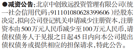 北京中创致远投资管理有限公司(统一社会信用代码:911101080628399606)经股东决定,拟向公司登记机关申请减少注册资本,注册资本由500万元人民币减少至100万元人民币,请债权债务人于见报之日起45日内向本公司提出债权债务或提供相应的担保请求,特此公告。