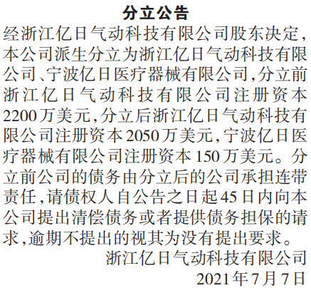经浙江亿日气动科技有限公司股东决定,本公司派生分立为浙江亿日气动科技有限公司、宁波亿日医疗器械有限公司,分立前浙江亿日气动科技有限公司注册资本2200万美元,分立后浙江亿日气动科技有限公司注册资本2050万美元,宁波亿日医疗器械有限公司注册资本150万美元。分立前公司的债务由分立后的公司承担连带责任,请债权人自公告之日起45日内向本公司提出清偿债务或者提供债务担保的请求,逾期不提出的视其为没有提出要求。