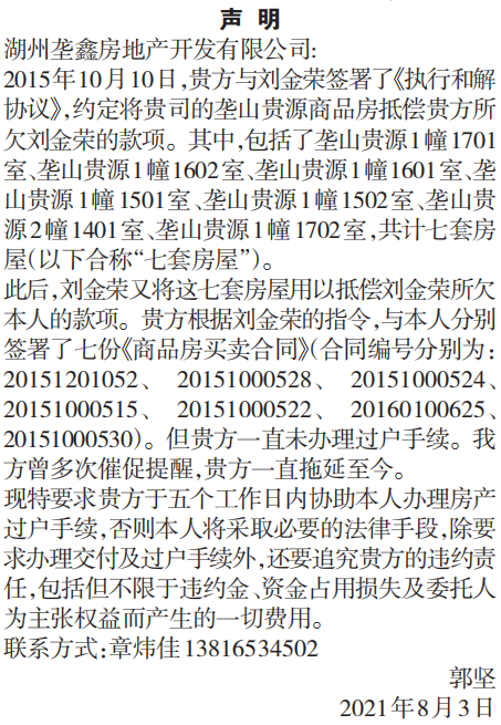 2015年10月10日,贵方与刘金荣签署了《执行和解协议》,约定将贵司的垄山贵源商品房抵偿贵方所欠刘金荣的款项。其中,包括了垄山贵源1幢1701室、垄山贵源1幢1602室、垄山贵源1幢1601室、垄山贵源1幢1501室、垄山贵源1幢1502室、垄山贵源2幢1401室、垄山贵源1幢1702室,共计七套房屋(以下合称“七套房屋”)。