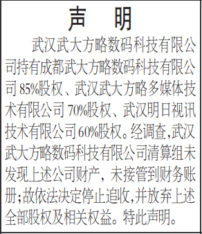 武汉武大方略数码科技有限公司持有成都武大方略数码科技有限公司85%股权、武汉武大方略多媒体技术有限公司70%股权、武汉明日视讯技术有限公司60%股权。经调查,武汉武大方略数码科技有限公司清算组未发现上述公司财产,未接管到财务账册;故依法决定停止追收,并放弃上述全部股权及相关权益。特此声明。
