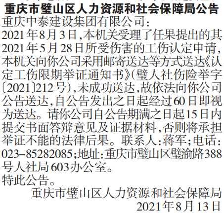 2021年8月3日,本机关受理了任果提出的其2021年5月28日所受伤害的工伤认定申请,本机关向你公司采用邮寄送达等方式送达《认定工伤限期举证通知书》(璧人社伤险举字〔2021〕212号),未成功送达,故依法向你公司公告送达,自公告发出之日起经过60日即视为送达。请你公司自公告期满之日起15日内提交书面答辩意见及证据材料,否则将承担举证不能的法律后果。联系人:蒋军;电话:023-85282085;地址:重庆市璧山区璧渝路388号人社局603办公室。