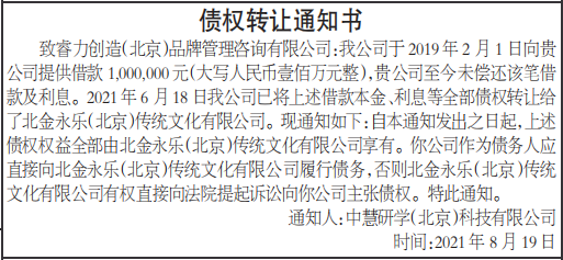 致睿力创造(北京)品牌管理咨询有限公司:我公司于2019年2月1日向贵公司提供借款1,000,000元(大写人民币壹佰万元整),贵公司至今未偿还该笔借款及利息。2021年6月18日我公司已将上述借款本金、利息等全部债权转让给了北金永乐(北京)传统文化有限公司。现通知如下:自本通知发出之日起,上述债权权益全部由北金永乐(北京)传统文化有限公司享有。你公司作为债务人应直接向北金永乐(北京)传统文化有限公司履行债务,否则北金永乐(北京)传统文化有限公司有权直接向法院提起诉讼向你公司主张债权。