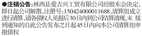 林西县爱吉兴工贸有限公司经股东会决定,即日起公司解散,注册号:150424000011688,清算组成立进行清算,请各债权人见报后30日内到公司结算清现,未接到通知的自此公告发布之日起45日内向本公司清算组申报债权。