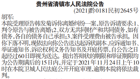 本院受理原告韩发菊诉你离婚纠纷一案,原告诉请要求:1、判令原告与被告离婚;2、双方无共同财产和共同债务,如有债务,各自的债务自己承担;3、案件受理费由被告承担。因你下落不明,现依法向你公告送达起诉状副本、应诉通知书、举证通知书、诉讼权利义务告知书及开庭传票,自公告之日起经过60日即视为送达。提出答辩状的期限和举证期限均为公告期满后的15日内,并定于2021年11月24日上午10时在本院卫城人民法庭公开开庭审理,逾期本院将依法裁判。