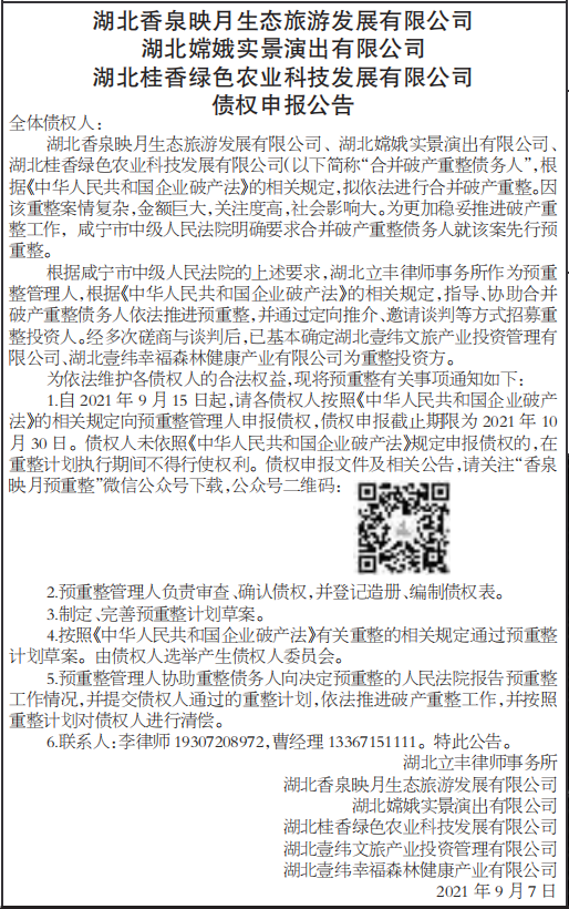 1.自2021年9月15日起,请各债权人按照《中华人民共和国企业破产法》的相关规定向预重整管理人申报债权,债权申报截止期限为2021年10月30日。债权人未依照《中华人民共和国企业破产法》规定申报债权的,在重整计划执行期间不得行使权利。债权申报文件及相关公告,请关注“香泉映月预重整”微信公众号下载,公众号二维码: