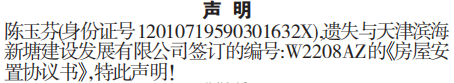 陈玉芬(身份证号12010719590301****),遗失与天津滨海新塘建设发展有限公司签订的编号:W2208AZ的《房屋安置协议书》,特此声明!