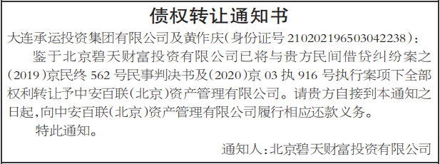大连承运投资集团有限公司及黄作庆(身份证号21020219650304****):
