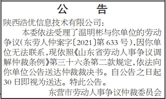本委依法受理了温明彬与你单位的劳动争议(东劳人仲案字〔2021〕第633号),因你单位无法联系,现依照《山东省劳动人事争议调解仲裁条例》第三十六条第二款规定,依法向你单位公告送达仲裁裁决书。自公告之日起30日即视为送达。