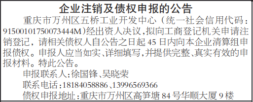 债权申报地址:重庆市万州区高笋塘84号华顺大厦9楼