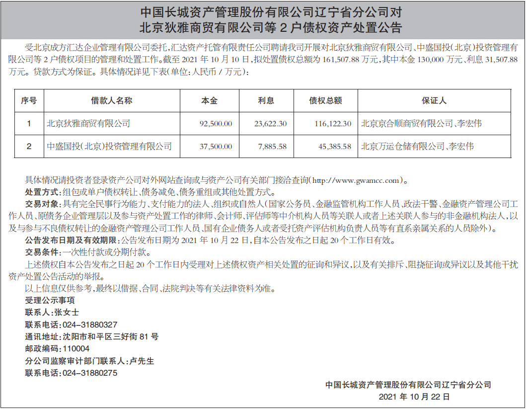 中国长城资产管理股份有限公司辽宁省分公司对北京狄雅商贸有限公司等2户债权资产处置公告