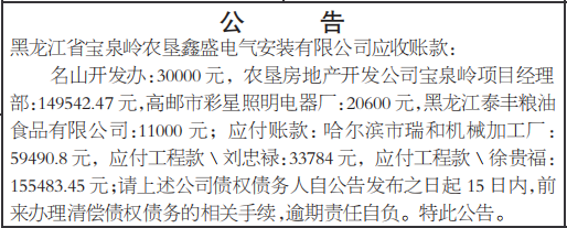 名山开发办:30000元,农垦房地产开发公司宝泉岭项目经理部:149542.47元,高邮市彩星照明电器厂:20600元,黑龙江泰丰粮油食品有限公司:11000元;应付账款:哈尔滨市瑞和机械加工厂:59490.8元,应付工程款\刘忠禄:33784元,应付工程款\徐贵福:155483.45元;请上述公司债权债务人自公告发布之日起15日内,前来办理清偿债权债务的相关手续,逾期责任自负。