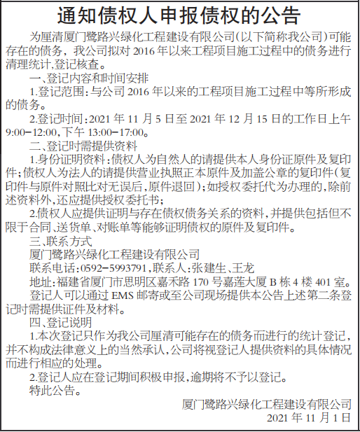 为厘清厦门鹭路兴绿化工程建设有限公司(以下简称我公司)可能存在的债务,我公司拟对2016年以来工程项目施工过程中的债务进行清理统计,登记核查。