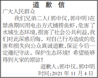 我们兄弟二人(郭中仪,郭中明)在禁渔期间用电击方式捕捞鱼虾,危害了水域生态环境,损害了社会公共利益,我们对此深感后悔,对自己行为造成的危害和损失向公众真诚道歉,保证今后一定遵纪守法,保护生态环境!希望能够得到大家的原谅!