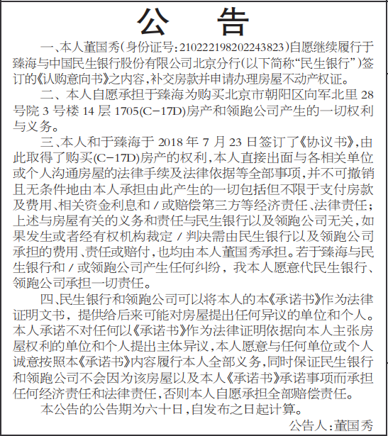 三、本人和于臻海于2018年7月23日签订了《协议书》,由此取得了购买(C-17D)房产的权利,本人直接出面与各相关单位或个人沟通房屋的法律手续及法律依据等全部事项,并不可撤销且无条件地由本人承担由此产生的一切包括但不限于支付房款及费用、相关资金利息和/或赔偿第三方等经济责任、法律责任;上述与房屋有关的义务和责任与民生银行以及领跑公司无关,如果发生或者经有权机构裁定/判决需由民生银行以及领跑公司承担的费用、责任或赔付,也均由本人董国秀承担。若于臻海与民生银行和/或领跑公司产生任何纠纷,我本人愿意代民生银行、领跑公司承担一切责任。