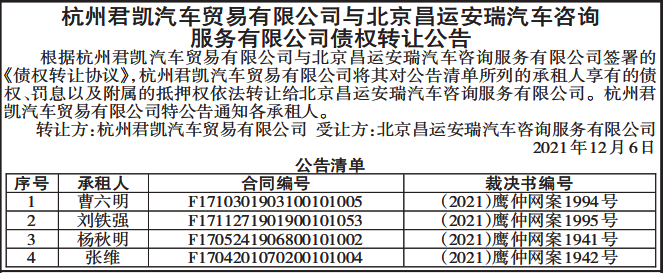 根据杭州君凯汽车贸易有限公司与北京昌运安瑞汽车咨询服务有限公司签署的《债权转让协议》,杭州君凯汽车贸易有限公司将其对公告清单所列的承租人享有的债权、罚息以及附属的抵押权依法转让给北京昌运安瑞汽车咨询服务有限公司。杭州君凯汽车贸易有限公司特公告通知各承租人。
