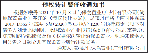 根据彭曦丹2021年10月8日与保荔置业(广州)有限公司(简称保荔置业)签订的《债权转让协议》,彭曦丹已将华南国仲深裁〔2017〕D365号裁决书及(2020)粤03执异1230号执行裁定书项下对债务人刘洪、陈坤明、中城镇农业产业投资(深圳)有限公司、李建功、陈宝明的全部债权及相关权益依法转让给保荔置业。现通知债务人自公告之日起立即向保荔置业履行还款义务。