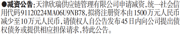 天津欣瑞供应链管理有限公司申请减资,统一社会信用代码91120224MA06U9NB78,拟将注册资本由1500万元人民币减少至10万元人民币,请债权人自公告发布45日内向公司提出债权债务或提供相应担保请求,特此公告。