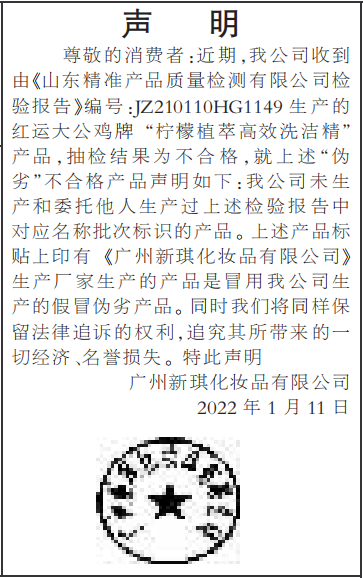 尊敬的消费者:近期,我公司收到由《山东精准产品质量检测有限公司检验报告》编号:JZ210110HG1149生产的红运大公鸡牌“柠檬植萃高效洗洁精”产品,抽检结果为不合格,就上述“伪劣”不合格产品声明如下:我公司未生产和委托他人生产过上述检验报告中对应名称批次标识的产品。上述产品标贴上印有《广州新琪化妆品有限公司》生产厂家生产的产品是冒用我公司生产的假冒伪劣产品。同时我们将同样保留法律追诉的权利,追究其所带来的一切经济、名誉损失。