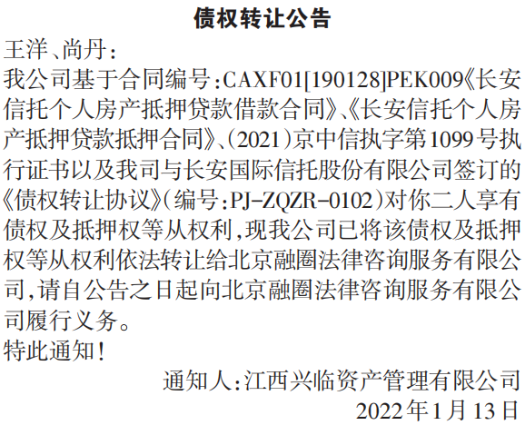 我公司基于合同编号:CAXF01[190128]PEK009《长安信托个人房产抵押贷款借款合同》、《长安信托个人房产抵押贷款抵押合同》、(2021)京中信执字第1099号执行证书以及我司与长安国际信托股份有限公司签订的《债权转让协议》(编号:PJ-ZQZR-0102)对你二人享有债权及抵押权等从权利,现我公司已将该债权及抵押权等从权利依法转让给北京融圈法律咨询服务有限公司,请自公告之日起向北京融圈法律咨询服务有限公司履行义务。